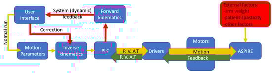 Figure 8 presents the dynamic control loop of the rehabilitation system. The functioning of the system is based on Normal Run sequence. In Normal Run, motion parameters (motion amplitudes, velocity, and number of repetitions) are given using the graphical user interface. Using inverse kinematics, data required for reaching the imposed amplitudes are transferred to the PLC which sends as inputs to the drivers the positions, velocities, accelerations, and a torque limit for the imposed motion (P.V.A.T). The drivers send the data to the motors and in exchange they read the state parameters of each motor (P.V.A.T.) and transmit the data to the PLC which provides dynamic feedback to the user. If there are differences between the data imposed via the Normal Run mode and those provided by the dynamic feedback, the system enters another state named Correction Run.