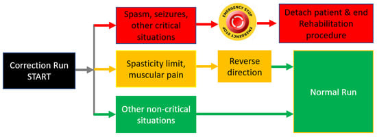 - The second scenario (Yellow scenario) includes reaching a spasticity limit or striving muscular pain. In this case, the system may return to the normal run after reversing direction. The system may re-enter the correction run mode when/if the spasticity limit is reached in the opposite direction. This scenario is represented with yellow arrows and yellow blocks in Figure 9 and the output of this scenario is Normal Run, the system that resumes the rehabilitation procedure until the next event.
