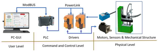 The components of the robotic system are divided into 3 levels. First level is the User Level, and it contains the graphical user interface (GUI) running on a PC and containing all the tools needed for inputting the rehabilitation parameters. The second level is the Command-and-Control Level, and it contains the Industrial PLC of the robotic system and the drivers required for controlling the motors of the robotic structure. The third level is the Physical Level, and it contains the motors required to drive the mechanical structure, the sensors needed for system initialization, and the mechanical structure of ASPIRE. The connection between the User Level and the Command-and-Control Level is made using Ethernet Cable and ModBus protocol, while the connection between the Command-and-Control Level and the Physical Level is made using special connector compatible with the drivers, motors, and sensors.