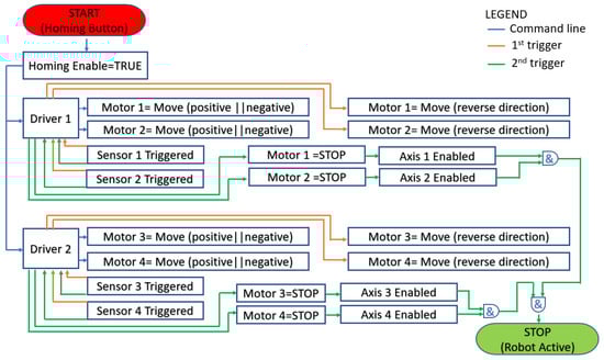 The entire process is coordinated using GUI that communicates with a PLC via ModBUS protocol. The PLC controls two drivers and each driver communicates with two servomotors and two proximity sensors. The communication between the drivers and servomotors is bidirectional; the driver communicates the required position and, at the same time, monitors the real-time position, velocity, acceleration, and torque recorded at the motor spindle. The communication between the sensors and the drivers is unidirectional from sensors to drivers. The sensors are used for system initialization. The process diagram for initialization is given in Figure 11.