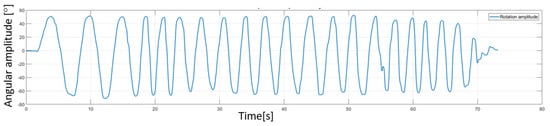 Besides the robotic system, a sensor system was used (Biometrics []). The sensor system uses a series of goniometers to simultaneously measure the angles in up to two planes of movement. During the experimental tests two goniometers were used. One was placed under the armpit of the subject to measure angles in two directions (flexion/extensions and adduction/abduction of the shoulder) and the other one was placed on the forearm of the subject to measure the rotation of the wrist with respect to the forearm (pronation/supination of the forearm). The decision to place the goniometers in this position came after a series of tests that revealed the optimal position to obtain most accurate reading during the rehabilitation motion. An image regarding this aspect of the experimental test is shown in Figure 13 along with a figure of the subject performing shoulder rehabilitation using the ASPIRE system. The amplitudes recorded by the biomedical sensors were not passed to the control system of the robot; the sensor system uses a separate graphical interface to calibrate each goniometer, and, after the calibration, the time-based variation of the amplitudes is graphically represented. The calibration of each goniometer is performed before placing the sensors on the patient by placing both ends of the goniometers on the same plane surface at the same time and pressing the interface “Calibrate” button. The entire calibration procedure for each goniometer takes up to 15 s. Each goniometer can read values between ±180 degrees with an accuracy of ±2 degrees measured over a range of 90 degrees and a repeatability of ±1 degree measured over a range of 90 degrees. The advantage of the system is given by the 12 h lasting battery and the wireless range up to 30 m. An example of the output of the sensor system for the pronation/supination motion is presented in Figure 14. The graph shows the rotation amplitudes recorded during a 20-repetitions session using a 50 degrees amplitude for pronation and 50 degrees amplitude for supination.