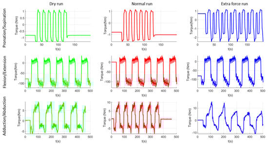 After performing the experimental tests with the healthy subjects, a supplementary dry run was made in order to establish the torques in the system when it is moving without any patient performing the rehabilitation. Figure 15 graphically represents the data recorded during the experimental test, which are then statistically analyzed. Median values from all runs were extracted and graphically represented using MatLab []. The first column of plots from Figure 15 represents the dry run test performed at the end of the experimental tests. These results should be similar to the ones obtained during the virtual simulation performed in the previous section of the paper and, as it can be seen, there are inconsistent differences between the results of the virtual simulation and the ones obtained using the experimental model. Table 3 summarizes the comparison between these data. The second column of plots represents the median values obtained during the experimental test, when the subject was creating no extra forces in the system. The third column represents the median values obtained when the subject of the experiment was opposing the rehabilitation motion. As it can be observed, there are some differences in the pronation/supination module. The maximum absolute value obtained is 1.10 Nm for the dry run test, 1.62 Nm for normal run test, and 2.45 Nm for the resisting test. There are also a series of differences in the flexion/extension module but it is not easy to identify them on the graphical representation. The maximum value obtained during the dry run test was 122 Nm, 131.39 Nm during the normal run, and 147.37 Nm during the resisting tests. Regarding the adduction/abduction module the maximum obtained value is 9.20 Nm for the dry run test, 10.47 Nm for the normal run, and 14.40 Nm for the resisting test.