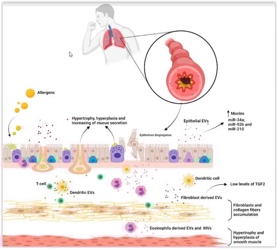 A study by Bartel and colleagues [39] revealed the role in asthma pathogenesis of miRNAs present in epithelial-derived EVs. miR-34a, miR-92b, and miR-210 in EVs can potentially lead to Th2 responses and maturation of DCs in the early development of asthma. Aberrant deposition of extracellular matrix contributes to the RMB thickening in asthma pathogenesis. On their surface, EVs secreted by fibroblasts expose fibronectin, which can trigger invasion-associated signaling pathways [40]. An in vitro study showed that exosomes produced by the fibroblasts of severe asthmatics contain a low level of TGF2, which inhibits epithelial cells proliferation, contributing to the narrowing of the airways [37]. In order to trigger an allergic response, allergens must be presented to T cells by DCs. In humans, it has been shown how DC-derived exosomes can directly present antigen to T cells [41].