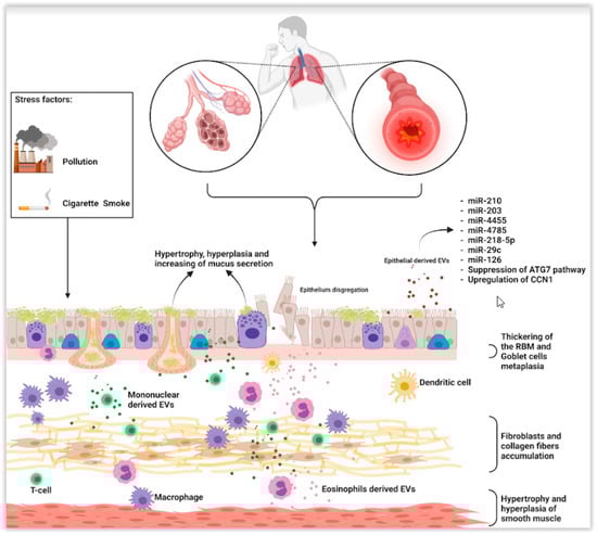 Scheme of COPD pathogenesis. Chronic external stimuli generate massive deregulation of lower airways. Chronic external stimuli generate massive deregulation or lower airways. EVs mediate these tissue changes directly and indirectly. Their production is also increased by the perennially present phlogistic status established with the progress of the pathology. The immune cell component contributes greatly to the release of EVs that affect all cell populations of the respiratory mucosa.