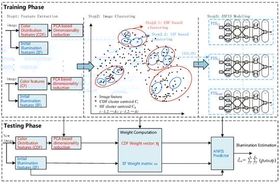As shown in Figure 1, the training phase contains three major steps: feature extraction, image clustering, and ANFIS modeling. By a two-step clustering strategy, training images are classified into different clusters according to color distribution features (CDFs) and initial illumination features (IIFs). Then multiple ANFIS models are effectively trained to regress the underlying relationship between image features and illuminant. In the testing phase, CDFs and IIFs will be extracted and the corresponding combination weights will be calculated dynamically. The final illuminant estimation is obtained by fuzzy weighting all outputs of ANFIS models.