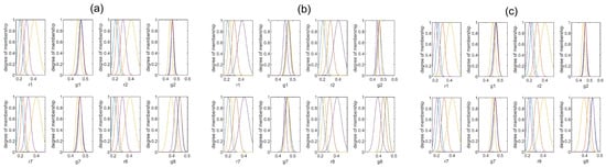 Examples of membership functions used by the ANFIS models developed for (a) estimation of r component, (b) estimation of g component, and (c) estimation of b component. In these three models, the inputs are chromaticity values of and () from the unitary algorithms: GW, WP, PCA-based, and LSR, respectively. The curves in cyan, purple, yellow, and magenta indicate the membership values for the four cluster regions respectively, responding to the number of clusters to be 4.