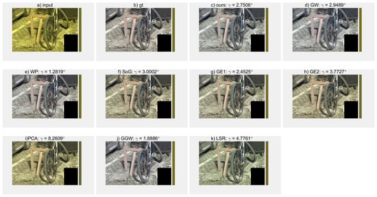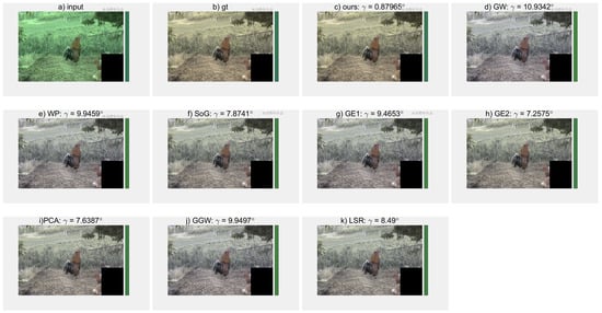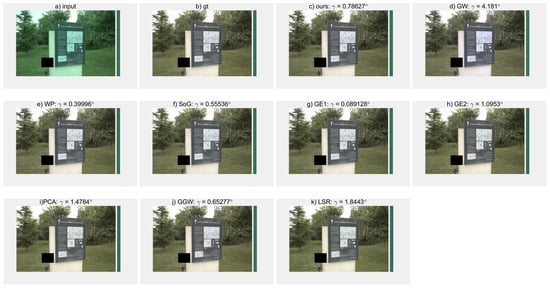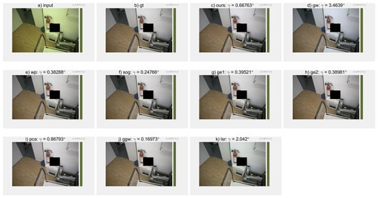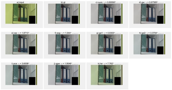 We provide some visual results for Gehler-Shi and Cube+ datasets, as shown in Figure 3, Figure 4, Figure 5, Figure 6 and Figure 7. For each input image, we show the ground truth, our estimated illuminant color and resulting white-balanced image, and other estimated illuminant colors and resulting white-balanced images using the unitary algorithms (GW, GGW, WP, GE1, GE2, SOG, PCA-based, and LSR). In these figures, the color bars on the right side of images (a) and (b) show the ground truth illuminant color. The color bar on the right side of images (c)–(k) shows the illuminant color estimated by the corresponding method, respectively. All images shown are rendered in sRGB color space.