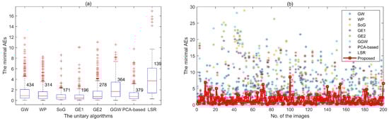 To further exploit better combination relationships, we design several combinations of these unitary algorithms to implement the proposed method. Some of them contain less than eight unitary algorithms. The experimental results are shown in Table 5. The results indicate that the configuration with the combination of GW, WP, PCA-based, and LSR results in the best illuminant estimation accuracy. Figure 8b shows the minimum AE distribution for each method versus minimum AE obtainable with this chosen combination. It clearly shows the proposed method outperforms most of the eight unitary algorithms. It should be noted that this optimal combination might be just applicable for our experiments based on Gehler-Shi and Cube+ datasets. This experiment also indicates that seeking optimal combination is necessary to improve performances for illuminant estimation.