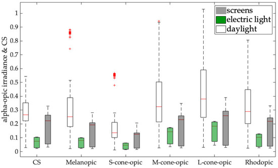 The α-opic irradiance and circadian stimulus (CS) for each of the three main sources of light in offices in commercial buildings. The red horizontal lines that divide the boxes into two parts mark the median (middle quartile). The boxes represent the inter-quartile range (the middle 50%) and the upper and lower whiskers show the highest and lowest non-outliers. The red crosses outside the boxes show the outliers.