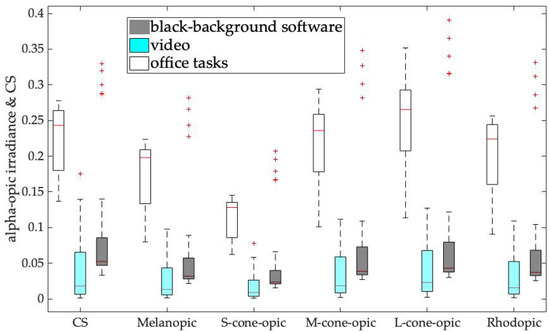 The circadian stimulus (CS) and α-opic irradiance caused by the light from different displays when different computer tasks were performed by users. The red horizontal lines that divide the boxes into two parts mark the median (middle quartile). The boxes represent the inter-quartile range (the middle 50%) and the upper and lower whiskers show the highest and lowest non-outliers. The red crosses outside the boxes show the outliers.