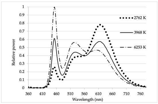 Measured spectral power distributions for 2762 K, 3968 K, and 6253 K light from a commercially available tuneable white lighting system.