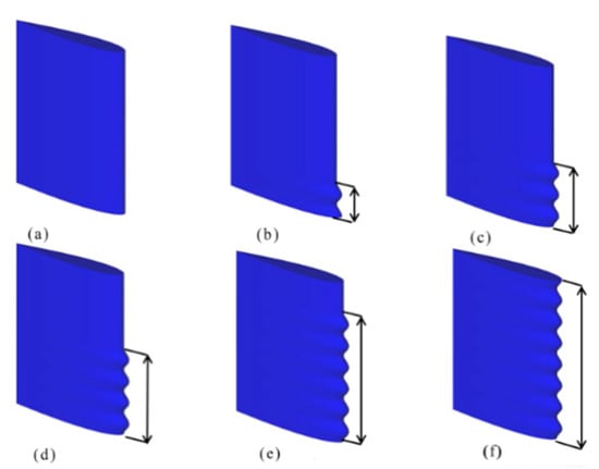 Airfoil models. (a) Baseline; (b) R = 0.2; (c) R = 0.4; (d) R = 0.6; (e) R = 0.8; (f) R = 1.0.