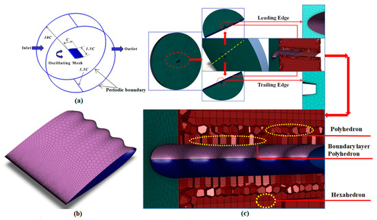 Figure 3a is a schematic of the computational domain and boundary conditions. The size of the calculation domain forming a cylindrical shape was defined by a radius of 10 C and a height of 1.5 C. The inlet and outlet boundaries were 10 C from the airfoil surface to avoid the boundary reflections, while the far-field boundary was set as the periodic boundary. In this case, the velocity inlet was set to 22 m/s and the pressure outlet was set as free-stream pressure. As shown in Figure 3b,c, an unstructured grid arrangement was used. A no-slip boundary condition was applied to the airfoil surface. When using the SST k-ω turbulence model, it was necessary to control the height of the grid perpendicular to the wall direction so that the wall nodes were in the viscous sublayer and y+ < 1.0. Consequently, these grid distributions were generated such that the y+ in the first layer of the grids adjacent to the airfoil surface was kept near 1.