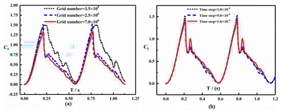 A grid convergence analysis was performed for three different mesh distributions (coarse, medium, and fine), namely 3.5 × 105, 2.5 × 106, and 7.0 × 106, as shown in Figure 4a. It can be seen that the results obtained from the medium and fine grids are in good agreement and establish a discrepancy with those from the coarse grid in terms of lift fluctuation and approximate period. Therefore, it can be considered that the grid independence of the solution was reached. The grid number of 2.5 × 106 was selected for all subsequent calculations for reasons related to computational cost and computational efficiency. Three kinds of time steps (1.0 × 10−4 s, 5.0 × 10−4 s, and 1.0 × 10−3 s) were selected for the verification of time-step independence (Figure 4b). The lift coefficient varied periodically with time. It was also found that the lift coefficients were entirely consistent at the time steps of 1.0 × 10−4 s and 5.0 × 10−4 s, whereas the lift coefficient was slightly different at the time step of 1.0 × 10−3 s. In the following simulations, the time step of 5.0 × 10−4 s was selected.