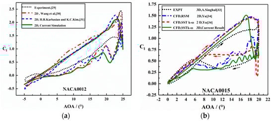 Figure 5b depicts the variation of the lift coefficient of the NACA0015 airfoil with the angle of attack during the dynamic stall. Additionally, it is compared with the experimental results of literature [33] and the 2D numerical simulation results of literature [34] using RSM and SST k-w models. The 3D numerical simulation calculations were used in this article. As shown in Figure 5b, the general trend of the lift curve calculated was consistent with the experimentally measured trend during most of the pitch cycle. The difference between the numerical simulation and the experiment of the lift coefficient is due to many factors. For example, the URANS method cannot faithfully resolve complex flows. The RSM and SST k-w methods produce almost the same results on the upstroke movement of the airfoil. The SST k-w model results in a smoother lift curve and more minor lift changes during the downstroke. Considering the complexity of dynamic stall, we judge that the results obtained using these two models are consistent.