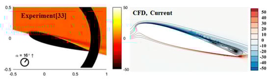 To further verify the validity of the calculation results, the transient vorticity field from our simulation was compared with the phase-averaged flow field from the experiment [33]. The flow separation region and the vorticity of the airfoil suction surface can be seen in the flow visualizations in Figure 6, which were obtained from the numerical simulation and experimental observations. The close similarity between the experimental and simulated flow patterns can also be seen.