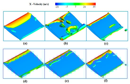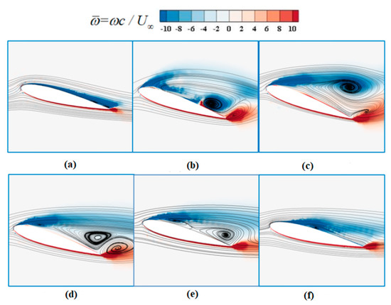 When the angle of attack was 14°, the airflow was completely attached to the airfoil surface and there was no flow separation (Figure 7a). The airflow at the trailing edge of the airfoil flowed back when the angle of attack increased. Next, the countercurrent increased rapidly and moved upstream. When the angle of attack reached 18°, two large-scale separation vortices were formed on the airfoil surface (Figure 7b). The lift decreased rapidly. When the angle of attack reached its maximum value of 20° and the flow on the upper surface of the airfoil was separated (Figure 7c). The airfoil then began to pitch down and it became completely stalled. Figure 7d–f show the detailed flow development in the final stage of the dynamic stall.