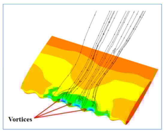 The flow deflection is distinguished by the changes in the curvature of the streamlines for an airfoil with a wavy leading edge. The streamlines in Figure 8 were selected to determine the structure of the significant vortex characteristics in the airflow near the airfoil surface. The sudden change of the streamline direction indicates that the vorticity reorganized near the leading edge