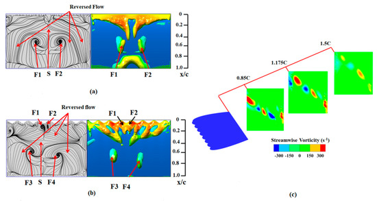 The main flow mechanism of the streamwise vortex formation can be explained from two different perspectives. From the first perspective, the spanwise vorticity varies along the airfoil’s spanwise direction according to Stokes’s law due to the cyclic distribution in the spanwise direction caused by tubercles. This means that the function of the tubercles produces ripples in the spanwise vortex of the airfoil. Similarly, each tubercle can be seen as a separated finite airfoil section. Considering that this finite airfoil produces a counter-rotating tip vortex in the direction of the flow, the periodic change of the spanwise circulation leads to the generation of a counter-rotating flow vortex. The second perspective has two main mechanisms for generating flow vortices: the so-called “skew induction” and “stress induction.” The skew induction mechanism is also called the first type of Prandtl secondary flow. The stress-induced mechanism is also known as the second type of Prandtl secondary flow, which arises from the anisotropy of the turbulent flow [35].