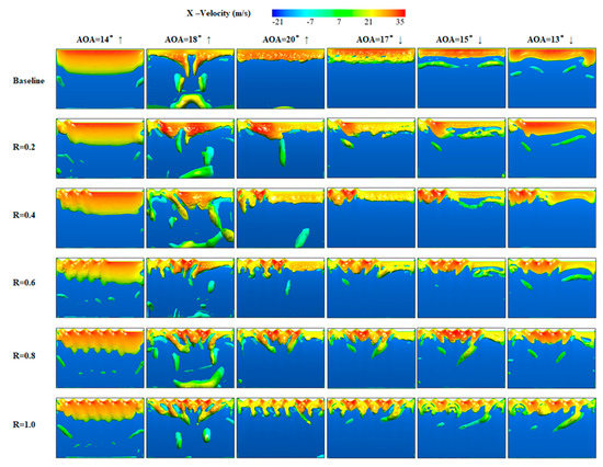 Figure 15b shows the Cp curves and flow fields when the angle of attack was increased to 18°. The Cl of the baseline airfoil was close to its peak value (the lift coefficient reached its peak value at an angle of attack of 17°) and the separation vortex almost covered the upper surface. As the vortex moved downstream, the low-pressure area moved backward and the Cp peak value decreased. The airfoil with R = 1.0 stalled at this moment, the primary separation vortex began to depart from the upper surface, and the low-velocity recirculation zone covered both the trough section and the second half of the crest section.