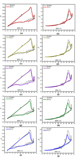 When R = 0.2, the peak lift coefficient of the bionic airfoil was almost the same as that of the baseline airfoil. When R = 0.4, the peak lift coefficient of the bionic airfoil decreased slightly. With increasing R, the bionic wavy leading edge gradually weakened the hysteresis effect of the airfoil lift coefficient.