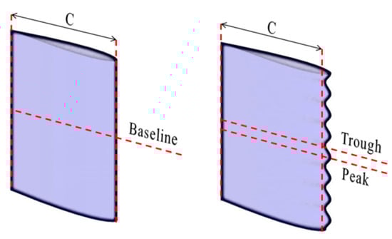 where C(z) is the local chord length of the airfoil, a is the wavy amplitude, and λ is the wavelength. In the present research study, the wavy amplitude is 0.025 C and the wavelength is 0.2 C. C is the chord length.