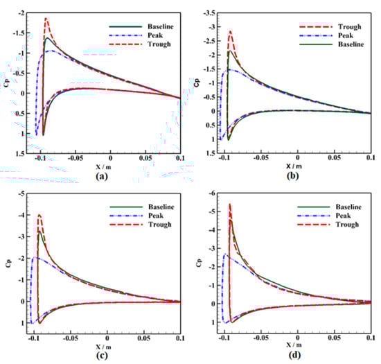 When the angle of attack increased to 5.8°, 8.5°, and 11.2°, Cl maintained linear growth (Figure 12) and the flow adhered to the airfoil surface. A comparison of the pressure coefficients of each section is given in Figure 14, where “Baseline” represents the cross-section of the baseline airfoil, “Peak” represents the cross-section of the crest, and “Trough” represents the trough section.