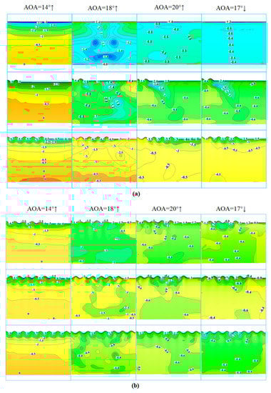 Flow fields and pressure coefficients of different sections at different angles of attack. (a) 14°↑ (b) 18°↑ (c) 20°↑ (d) 17°↓.