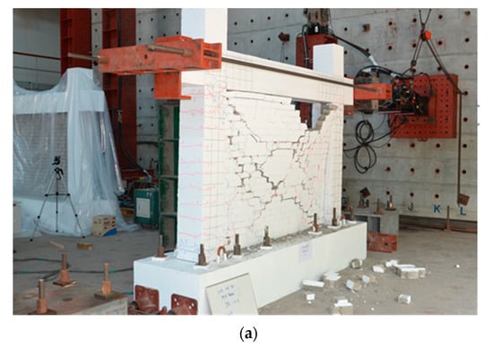 Figure 2 shows the elevation and section view of the specimens. The dimensions and reinforcements of the frame members are the same in all specimens, 2500 mm in span and 1750 mm in height. The dimensions of the cross-sections of the columns and beams were 300 × 300 mm and 350 × 300 mm, respectively. The columns have 8-D16 for longitudinal reinforcement and D10@150 for transverse reinforcement. The beams have identical reinforcement to the column member. Both columns and beams are designed so that flexural yield precedes shear failure. A running bond and English bond were used for single wythe and double wythe masonry walls, respectively.