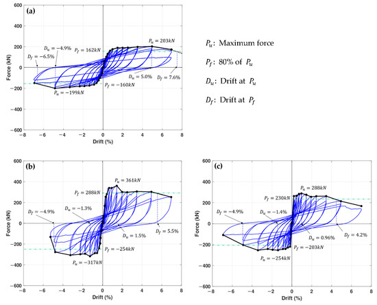 Figure 9 shows the graphs of the load–displacement relationship of each specimen. In BF, flexure failure occurred. The maximum force in the positive and negative directions was 203 and −199 kN, respectively, which are similar to each other. Additionally, the maximum drifts, defined as the drift when the force decreased to 80% of the maximum force, were 5% and 4.9% in the positive and the negative directions, respectively.