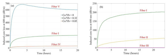 Core loss induced at 600 nm by photo-darkening measured (a) in three fibers with similar Yb concentrations but different Ce/Yb ratios (see Table 2), and (b) in the three fibers used in the fiber amplifiers.