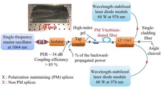 The MOPA architecture is shown in Figure 2. The seed laser was a 1064-nm diode-pumped solid-state laser (Cobolt, a Hübner Group Company). It is based on a unidirectional ring-cavity design and can generate up to 3 W of linearly polarized output power with a polarization extinction ratio (PER) greater than 30 dB. The laser 3-dB linewidth, measured with a delayed self-heterodyne interferometer, was ~150 kHz. It was kept below 2.5 W not to exceed the power rating of the tap coupler. Its output was free-space coupled into a PM isolator with a coupling efficiency of ~85% for the 10-µm-core fiber, and 90% for the 15-µm-core fibers. A 1% polarization-maintaining (PM) tap coupler was spliced to the output fiber of the isolator to monitor the backward-propagating power returning from the amplifier. The 99% output fiber pigtail of the tap coupler was spliced to the PM Yb-doped fiber. The active fiber was coiled around an aluminum spool with a diameter of 8 cm, so that the two 15-μm-core fibers, which are multimode at 1064 nm, carry a single mode. The spool had a U groove for better conductive cooling, and the fiber was covered by copper tape for increased heat conduction. The Yb-doped fiber was cladding-pumped in the backward direction by two wavelength-stabilized fiber-coupled 976 nm pump diode modules with a maximum power of 60 W each. The pump modules were spliced to the 105/125 µm pump fibers of a high-power pump/signal (2+1)×1 PM combiner. Finally, the output end of the Yb-doped fiber was spliced to the output fiber of the combiner. The pump power reflected by the combiner and the unwanted signal power in the cladding were efficiently removed by a 20-cm single-cladding passive fiber with the same core size as the gain fiber. Its output end was cleaved at 8° to avoid reflections. A high-index gel was placed at the pump-output end of the Yb-doped fiber (see Figure 2) to remove unabsorbed pump light from the cladding.