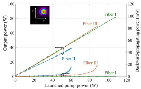 Figure 3 presents the output power and backward SBS power measured against pump power for all three amplifiers with gain-fiber lengths of 1.05 m (I), 2.83 m (II), and 3.28 m (III). The lengths of the combiner’s fiber pigtails were shortened as much as possible (~48 cm) to increase the SBS threshold. The launched seed power was ~2 W. No limit due to SBS was observed for fiber I up to the maximum pump power of 107.4 W, providing an output power as high as 81.5 W (green filled lozenges in Figure 3). Significantly lower output power was reached with fiber II, with an observed SBS threshold of 33 W, while an SBS-limited output power of 58 W was reached with the larger (15 µm) core fiber III. A much shorter gain fiber would be required to increase the SBS threshold further using fiber III, but this would reduce the slope efficiency considerably. The slope efficiency with fiber I was 75%, only slightly lower than with fiber III (78%).