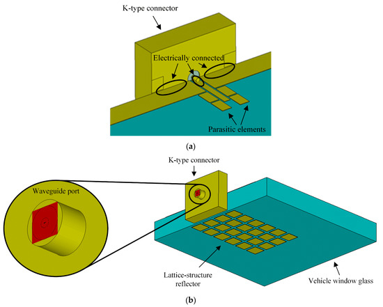 Figure 1 shows the geometry of the proposed printed 5G monopole antenna on the vehicle window glass with the parasitic elements and lattice-structure reflector to improve the bore-sight gain and minimize the radiation pattern distortion. The proposed antenna consists of the CPW feeding structure, the monopole radiator with parasitic elements, and the lattice-structure reflector. The CPW has an inner conductor (length l2 × width w4) and grounds (length l2 × width w2). The gap between the inner conductor and grounds is g1. The CPW is printed on the top of the thick vehicle window glass substrate (εr = 6.9, tanδ = 0.017 at 28 GHz) with dimensions of w1 × l1 × t (width × length × thickness). Note that the guided fields from the CPW line are less affected by substrate thickness compared to other transmission lines (i.e., strip line, microstrip, and CPW with a ground) that induce more electromagnetic fields inside the substrate. This CPW line is fed by a K-type (2.92 mm) connector [21], and we modeled the actual geometry to consider the effects of the connector, as shown in Figure 2. The K-type connector is excited by using a waveguide port at the starting points of the inner and outer conductors, which is directly connected to the coaxial cable, to feed the CPW in the simulation conditions. The monopole radiator is directly connected to the CPW inner conductor and has a length of l4 and a width of w4 for resonance at 28 GHz. This monopole has the LP characteristic that can have advantages for the design and fabrication of an antenna, and in general, it is widely employed for 5G vehicular communications [22,23,24,25]. The parasitic elements have four rectangular patches (l3 × w3) that are placed at the distances g1 and g2 from the monopole radiator and the CPW ground, respectively. When adjusting these dimensions, the parasitic elements operate as a radiator by indirect coupling with the monopole radiator. Furthermore, the electromagnetic waves radiated from each parasitic element can be combined with those radiated from the monopole radiator that results in increasing the bore-sight gain. The lattice-structure reflector is printed on the opposite side of the monopole radiator. The reflector is composed of multiple square patches with a width of w5, and the distance between the adjacent patches is g3. The number of reflector elements is M × N, where M and N indicate the total number of reflector patches along the x- and y-axes. The adjustment of the reflector parameters can effectively minimize the radiation pattern distortion that occurs due to the thick vehicle window glass in accordance with the wavelength at 28 GHz. Herein, design goals for this work are as follows: operating center frequency of 28 GHz, bandwidth of more than 850 MHz, reflection coefficient less than −10 dB, bore-sight gain of more than 0 dBi, LP, and glass substrate thickness of 3.2 mm. To achieve the goals, the proposed antenna was modeled and optimized using the CST Studio Suite full EM simulator, and the optimized design parameters are listed in Table 1.