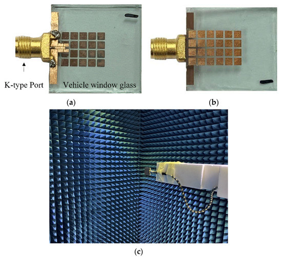 With the dramatic development of wireless communication technology, interest in vehicle communication systems has been increasing considerably in various applications, such as autonomous driving [1,2,3], telematics service [4,5,6], and vehicle-to-everything (V2X) communications [7,8,9,10,11]. In recent years, these systems require 5G wireless communication technology for high-throughput and low-latency in an ever-changing communication environment. In particular, for vehicle applications, it is significantly important to employ high-gain 5G antennas to maintain a stable 5G communications link while driving. Many studies have investigated the use of conventional antenna structures, i.e., patch antennas [12], dipole antennas [13,14], and dielectric resonator antennas [15] in 5G vehicle antenna designs. In some cases, research has attempted to apply such conventional antennas to actual vehicles using additional structures; for example, the vehicle roof is re-designed and modified to construct a cavity structure for mounting a 5G inverted-F monopole antenna [16]. Although these antennas have shown high antenna performances, the need to modify the vehicle structure or add new structures to the vehicle creates a disadvantage for their adoption as 5G wireless vehicle communication systems. To resolve these problems, a number of antenna designs that directly print the antennas onto the vehicle window glass have been reported, for example, mesh-grid strip line patterns [17], horizontal strip line patterns [18], and printed inverted-F antenna [19]. However, in general, on-glass antennas have been employed for low-frequency band applications below 1000 MHz, such as amplitude modulation broadcasting (AM), frequency modulation broadcasting (FM), and digital multimedia broadcasting (DMB). In addition, the linear polarization (LP) characteristic is essential for 5G vehicle communications. Thus, there needs to be more in-depth research to develop glass-printed antennas with monopole radiators to achieve the LP property.