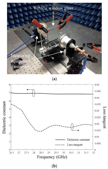The measured EM characteristics of the thick vehicle window glass substrate: (a) measurement setup; (b) dielectric constant and loss tangent according to the frequency.