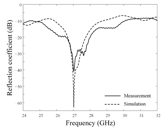 Figure 3 shows photographs of the fabricated 5G monopole antenna with the parasitic elements and the lattice-structure reflector on vehicle window glass. In general, glass antennas are fabricated or printed on vehicle glass using a silk-screen method [17] or an epoxy resin adhesive. However, such methods have low conductivity in the electrical connection, poor manufacturing tolerance, and low thermal durability in the fabrication of the glass antenna. To solve these problems, the proposed antenna is fabricated by etching the copper layer and employing a thermosetting adhesive to strongly stick the copper patterns to vehicle window glass. The proposed antenna is directly fed by the K-type (2.92 mm) connector, and the inner and outer conductors of the feeder are electrically connected to CPW by soldering. Note that the actual K-type connector is modeled and excited by using a waveguide port at the starting points of the inner and outer conductors to feed the CPW in the simulation conditions. On the bottom of the vehicle window glass, which is electrically isolated from the antenna feeder, the lattice-structure reflector patches are printed. To confirm feasibility, the fabricated antenna is measured in a full anechoic chamber to obtain the antenna characteristics, such as gains, reflection coefficients, and radiation patterns. To minimize the cable effects, a jig with a low dielectric constant is used to stand the proposed antenna in the air of the anechoic chamber, where the cable is connected to the K-type connector with the jig. In addition, the thick vehicle window glass substrate is measured to obtain the specific EM characteristics according to the frequency of the measurement setup, as shown in Figure 4. The measured dielectric constant (εr) and loss tangent (tanδ) are 6.9 and 0.017 at 28 GHz, respectively, and then the measured results are employed as input parameters to simulate the proposed antenna. Figure 5 presents the measured (solid line) and simulated (dashed line) reflection coefficients of the proposed antenna. The measured reflection coefficients agree well with the simulated results, and the values at 28 GHz are −20 dB and −15.6 dB, respectively. Figure 6 presents the bore-sight gain of the proposed antenna with and without parasitic elements. The proposed antenna with the parasitic elements has measured and simulated bore-sight gains of 2 dBi and 1.6 dBi at 28 GHz, while the simulation result of the vehicle window glass antenna without the parasitic elements is 0.3 dBi. In addition, the gain bandwidth over 0 dBi increases from 1.7 GHz to 3 GHz, according to the existence and absence of the proposed parasitic elements. The gain of the proposed antenna seems to be slightly lower than that of conventional monopole antennas due to the high dielectric loss of the thick vehicle glass. It results in the radiation efficiency of 33.68% at 28 GHz, but this radiation efficiency can be enhanced when the dielectric loss of the antenna substrate becomes lower. Figure 7 illustrates the measured and simulated radiation patterns in zx- and zy-planes at 28 GHz and 29 GHz, where the solid line and dashed line indicate the measured and simulated results, respectively. The measured half power beam widths are 42° and 64° in the zx- and zy-planes at 28 GHz. The measured maximum gains are 2.3 dBi and 2.1 dBi at angles of −25° and −1° in the zx- and zy-planes at 28 GHz, respectively. The measured radiation patterns are in good agreement with the simulated radiation patterns at 29 GHz. Figure 8 illustrates the 3D radiation patterns of the proposed antenna according to the frequency to observe the maximum gains. The maximum gains of the proposed antenna are 0.3 dBi, 3.2 dBi, and 3.4 dBi at 26 GHz, 28 GHz, and 30 GHz, respectively. To confirm the feasibility, the antenna characteristics such as the operating frequency band, the maximum gain, the antenna dimensions, and the substrate material of the proposed antenna are compared to those of previous studies, as listed in Table 2.