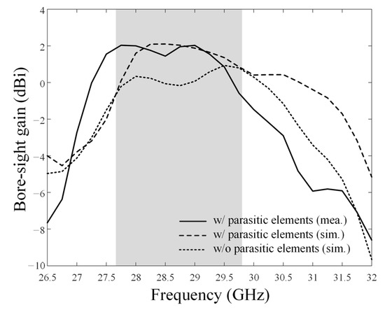Measured and simulated bore-sight gains of the proposed antenna with and without parasitic elements.