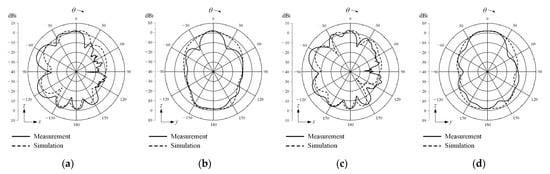 Measured and simulated radiation patterns of the proposed antenna: (a) zx-plane at 28 GHz; (b) zy-plane at 28 GHz; (c) zx-plane at 29 GHz; (d) zy-plane at 29 GHz.