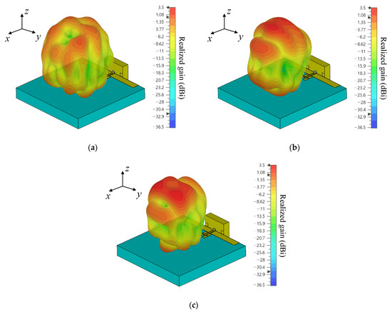 Three-dimensional patterns: (a) at 26 GHz; (b) at 28 GHz; (c) at 30 GHz.