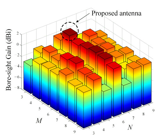 Figure 9 shows the bore-sight gain results according to the number of reflector patches. The M and N values are varied from 3 to 9 to observe the gain properties of the proposed antenna. The resulting maximum bore-sight gain of 1.6 dBi is observed when the patches of the lattice-structure reflector are arranged with a 4 × 6 (M × N) planar array. We further examine the gain characteristics by changing other reflector patch parameters to obtain the optimum bore-sight gain. Figure 10a illustrates the bore-sight gain in accordance with the gap between and the width of the reflector patches. In the fixed 4 × 6 (M × N) arrangement, the bore-sight gain is observed to be in the ranges of 1.5 mm ≤ w5 ≤ 2.5 mm and 0.1 mm ≤ g3 ≤ 0.9 mm. The increment of the reflector patch width usually improves the bore-sight gain, while that of the gap reduces the bore-sight gain. In addition, these parameters can adjust the reflection coefficients for impedance matching characteristics, as shown in Figure 10b. When w5 is less than 2 mm, and g3 is more than 0.5 mm, impedance matching for the proposed antenna improves. From the results, the optimal values for parameters w5 and g3 of the lattice-structure reflector can be determined to be 2 mm and 0.5 mm. Furthermore, a patch width of w5 can improve the bore-sight gain through the minimization of the pattern distortion, and there is another key design parameter of w3 that can adjust the impedance matching characteristic of the proposed antenna. In addition, we simulate the proposed antenna mounted on an actual vehicle model to observe the vehicle platform effects. The partial vehicle model, where the dimensions were over 20 wavelengths at 28 GHz, is used to analyze the radiation characteristics of the proposed antenna due to the limited computational resources. Figure 11a illustrates the simulated 3D radiation patterns according to the mount location of the proposed antenna: front, rear, left side, and right side of the vehicle window. The radiation patterns of the proposed antenna with the vehicle platform are similar to those of the stand-alone antenna, but it has small fluctuations due to the ground effect, as can be seen in Figure 11b. The results confirm that the proposed antenna is feasible for 5G communication in vehicle applications with high gain performance by optimizing the parasitic elements and the lattice-structure reflector.