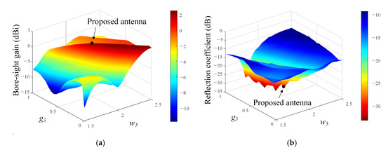 Bore-sight gain and reflection coefficient in accordance with the variations of parameters w5 and g3: (a) bore-sight gain; (b) reflection coefficient.