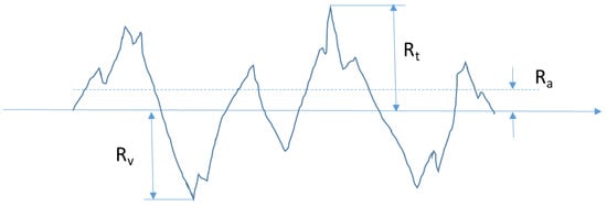 A schematic profile of surface roughness and its parameters, where Ra is the arithmetic average of the roughness measurement, Rt is the maximum peak vales and Rv is the maximum valley value.