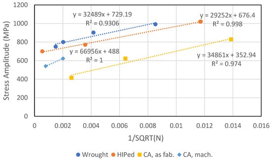 The fatigue test data of H1025 heat-treated wrought 17-4 PH, CA-H1025 heat-treated LB-PBF 17-4 PH and the HIPed and CA-H1025 heat-treated LB-PBF 17-4 PH stainless steel specimens are shown in Table 3, Table 4 and Table 5, respectively. First, Equation (4) is used to analyze the fatigue data below the yield strength. Rearranging Equation (4), the fatigue strength for a given number of cycles can be expressed as: