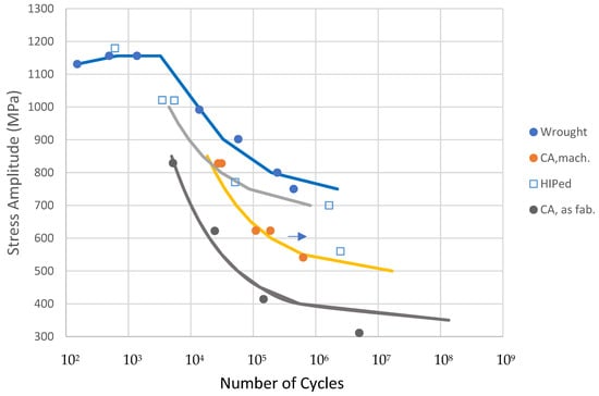 Fatigue test results of HIPed LB-PBF 17-4 PH stainless steel with the machined surface under axial loading (test information and data taken from [13]).