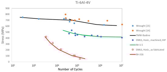 Due to the limited scope, the current analysis cannot cover all previous studies but can only take data from references [14,21]. The wrought material fatigue data are taken from reference [21], which is considered as the baseline, and the behaviour is described by Equations (3) and (4) with = 1 and M = 1, i.e., the baseline Equations (1) and (2), as given in Table 7. The DMLS Ti6Al4V fatigue data are digitized from reference [14]. The fatigue behaviours of AM Ti6Al4V are described by Equations (3) and (4), while and M are evaluated in a similar way by Equations (5) and (6), and the values are given in Table 8. The calculated curves are shown in Figure 5, which are in good agreement with the experimental data.