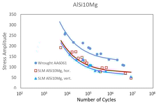 Interestingly, the horizontal AM microstructure factor (M = 1.7) is close to the other AM materials analyzed in this study. The vertical direction has a slightly higher microstructural factor (M = 2.08), but all within the range as caused by round ellipsoidal voids. The surface finish factor of SLM AlSi10Mg is 0.756 in both directions, as the polished surface roughness is quite low with = 1.5 μm. Fatigue crack nucleation in SLM AlSi10Mg was found to originate from pores, either internal or at the surface [14].