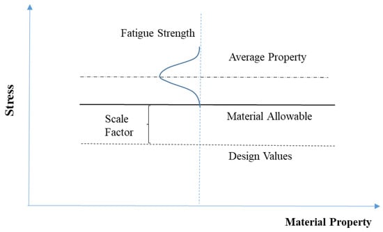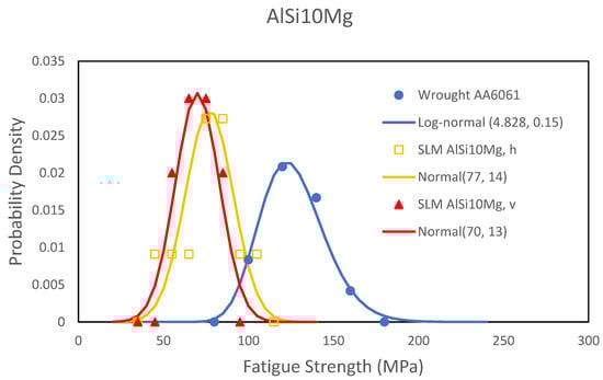 Then, Equation (8) is used to evaluate the coupon level for every test, and the results are given in Table 10 for wrought Al 6061 and SLM AlSi10Mg. This set of data can be turned into statistical distributions as shown in Figure 7, and the distribution functions and parameters are given in Table 11. The fatigue endurance limit of wrought Al 6061 can be represented by a log-normal distribution, but interestingly, that of the AM AlSi10Mg materials appear to be a normal distribution. During the AM process, the material’s microstructure is formed from powders under high energy input by a laser, which reasonably creates a new microstructure with a normal (symmetrical) distribution of properties. On the other hand, the wrought material has gone through complex thermomechanical processing, which may skew the property distribution. Other examples of the statistical distribution of properties can be found in metallic glasses [29,30]. It is beyond the scope of the current study to completely characterize the statistical distribution of processing-microstructure-property relationships for AM materials, but it is certainly an interesting point of future study. Nevertheless, once the AM material property distribution is determined, the design allowables can be evaluated for application of AM materials, as schematically shown in Figure 8 [7]. The TMW model can facilitate such evaluation by means of its simple analysis and fewer tests to determine the fatigue endurance limit, as opposed to the conventional method to conduct many material fatigue tests, up to 107 cycles.