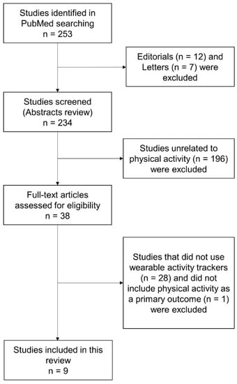 In this narrative review, the author focuses on the impact of the COVID-19 pandemic on physical activity measured using wearable activity trackers. The author performed a literature search on COVID-19 and wearable devices in PubMed. The search terms were “COVID-19” and “wearable”. The titles and abstracts of the identified articles were reviewed to determine their relevance. The author excluded editorials, commentaries, and letters. The search of PubMed from its inception to August 2021 yielded 253 articles. Of these, nine studies were included in this review (Figure 1).