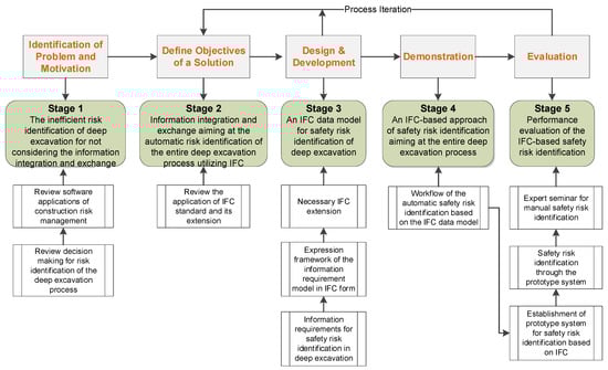 Aiming at the automatic risk identification of deep excavation, this research proposes a BIM-based central database, using IFC definitions, to express the risk identification-related information and involved relationships to fill the research gap on information integration and exchange. Furthermore, a safety risk identification approach focusing on the entire deep excavation process is presented. For a systematic and clear process to achieve the above objective, this research adopts the design science research approach, which is a practical multidisciplinary research method applied to various domains []. As shown in Figure 1, the process based on the design science research approach incorporates five stages. The motivation of this research is created by reviewing the decision-making for risk identification of the deep excavation process and related assisting platforms (i.e., Stage 1). Then, the research objective is the realization of information integration and exchange for the automatic safety risk identification of the entire deep excavation process using a BIM-based central database (i.e., Stage 2). An IFC data model is established by summarizing the information requirements of safety risk identification and completing necessary IFC extension work (i.e., Stage 3). The automatic safety risk identification approach focusing on the entire deep excavation process is presented based on this IFC data model (i.e., Stage 4). Finally, a prototype system for risk identification is designed, and a case study is conducted. In comparison with the manual safety risk identification results, the performance evaluation of the IFC-based safety risk identification is completed (i.e., Stage 5). In the following sections, Stages 3–5 of the research are explained in detail.